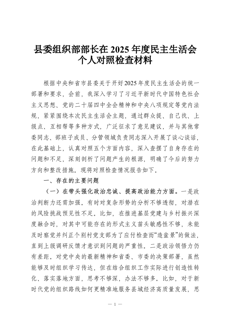 首页精选范文县委组织部部长在2025年度民主生活会个人对照检查材料