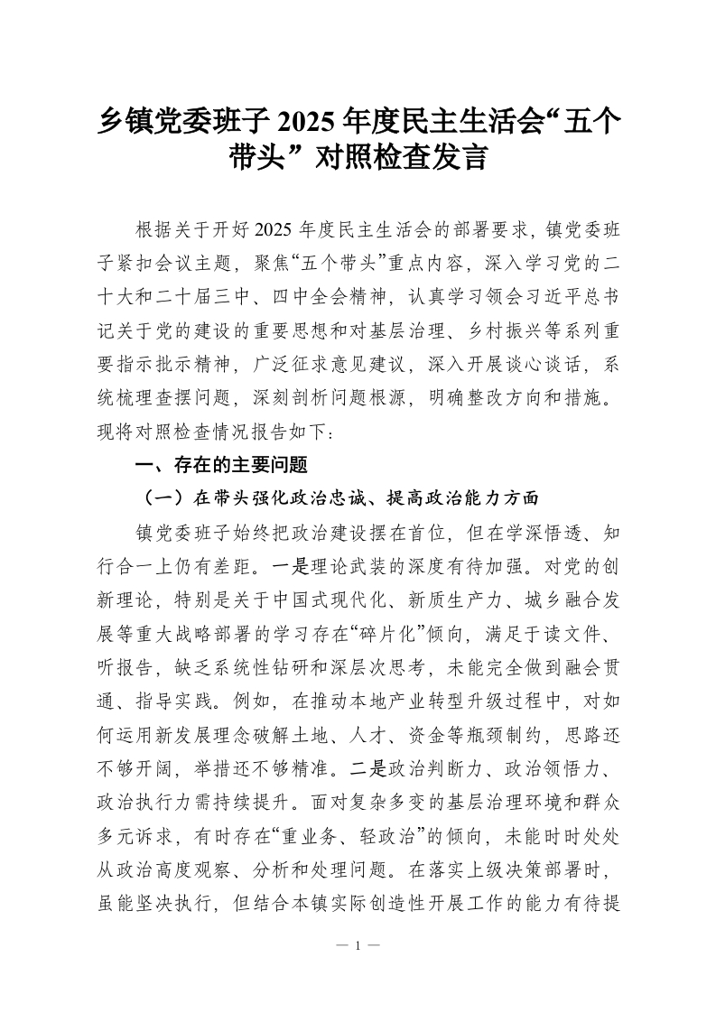 乡镇党委班子2025年度民主生活会“五个带头”对照检查发言