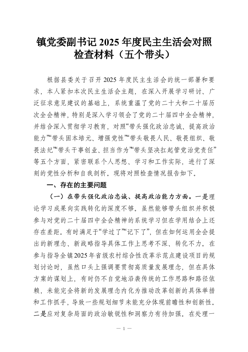 首页精选范文镇党委副书记2025年度民主生活会对照检查材料(五个带头)