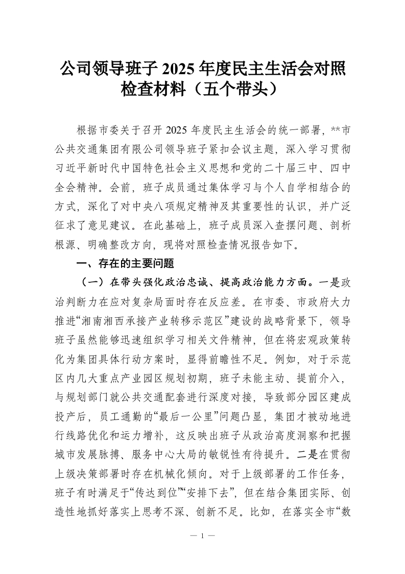 公司领导班子2025年度民主生活会对照检查材料(五个带头)