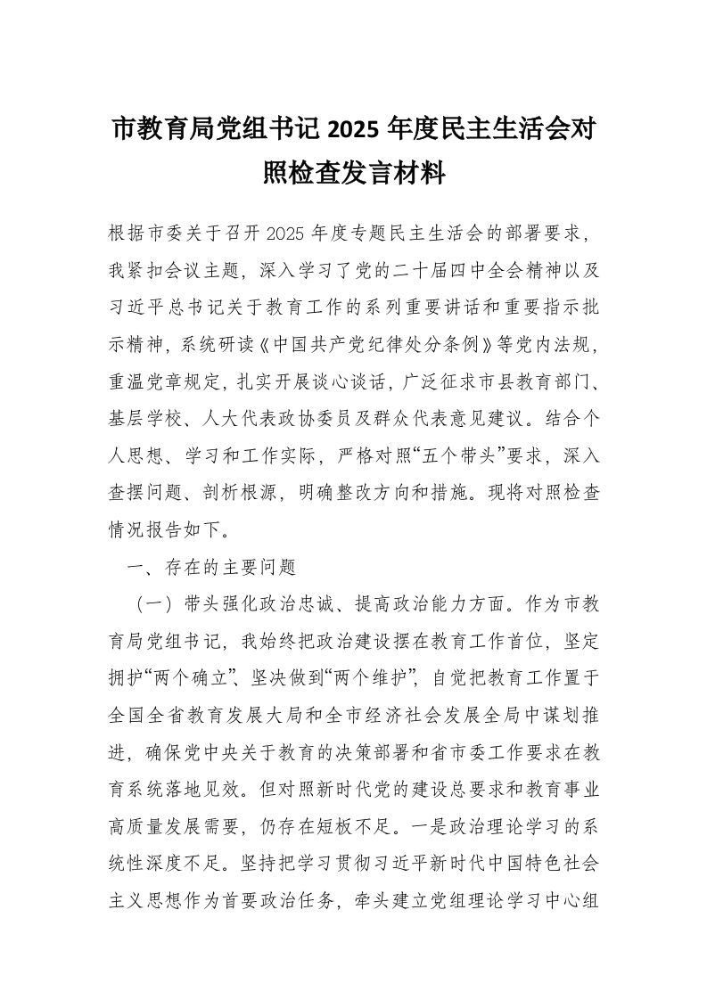 首页工作文档市教育局党组书记2025年度民主生活会对照检查发言材料