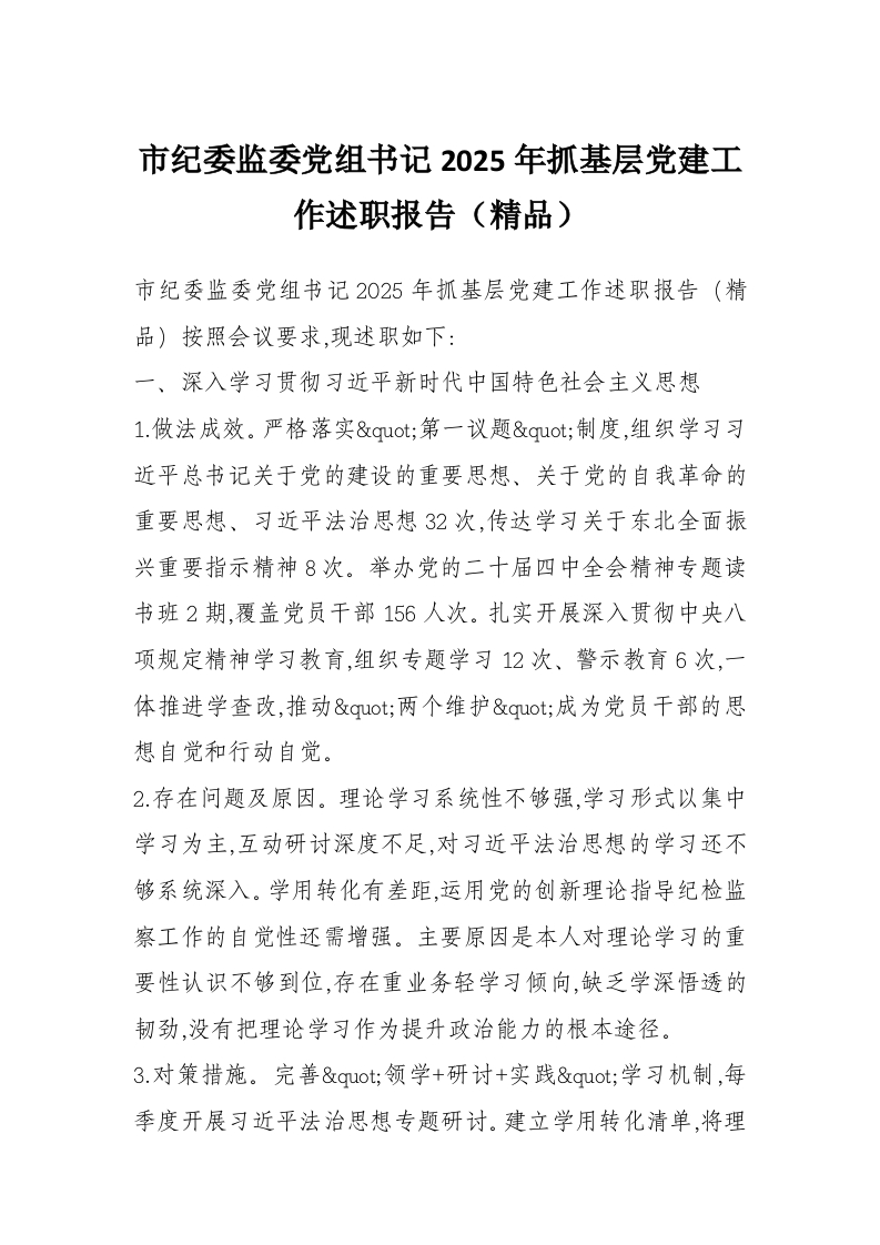 市纪委监委党组书记2025年抓基层党建工作述职报告(精品)