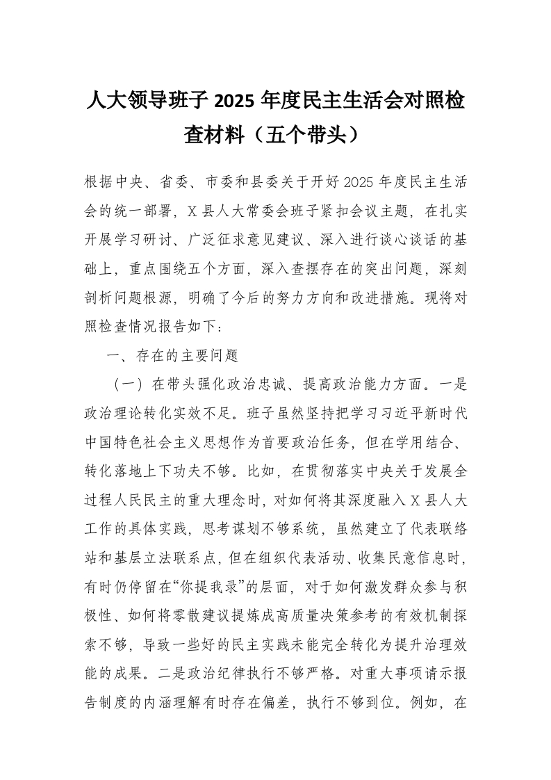人大领导班子2025年度民主生活会对照检查材料(五个带头)