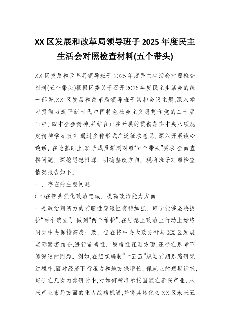 XX区发展和改革局领导班子2025年度民主生活会对照检查材料(五个带头)