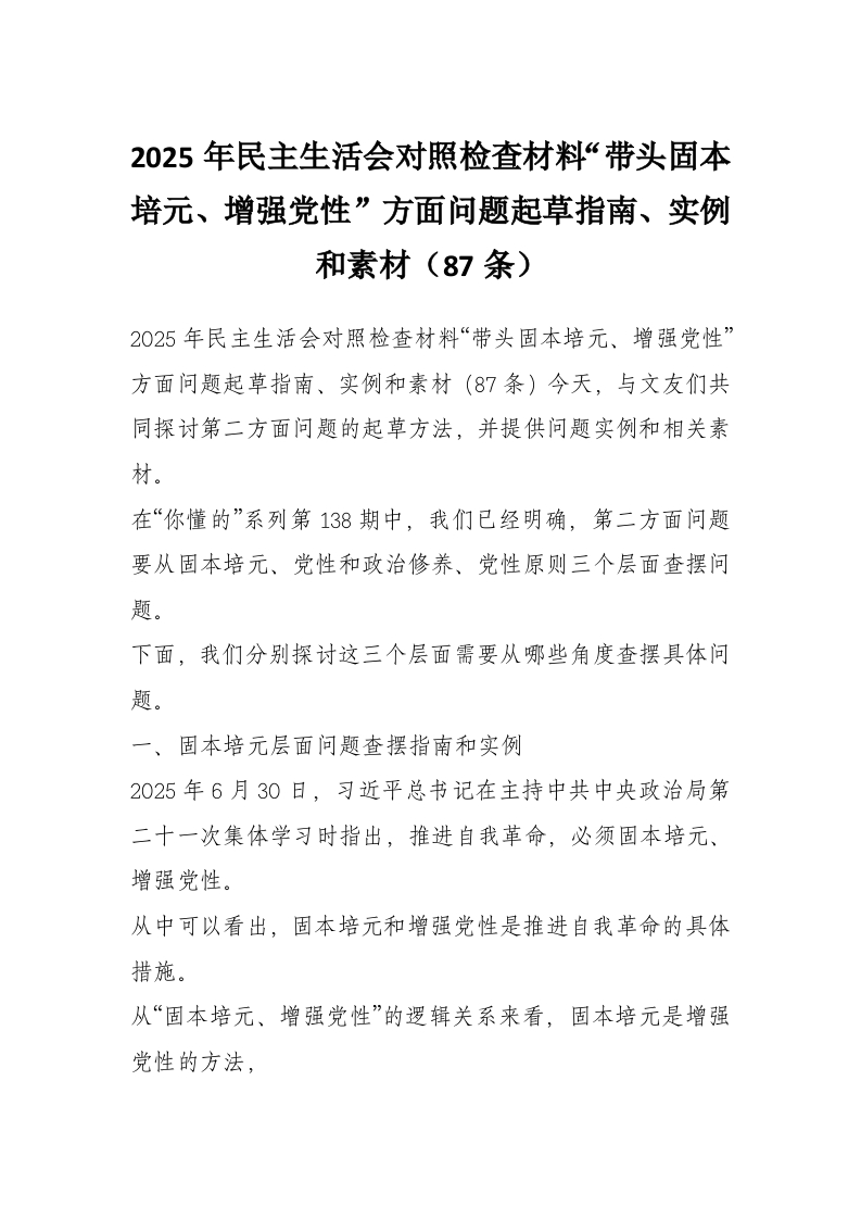 2025年民主生活会对照检查材料“带头固本培元、增强党性”方面问题起草指南、实例和素材(87条)