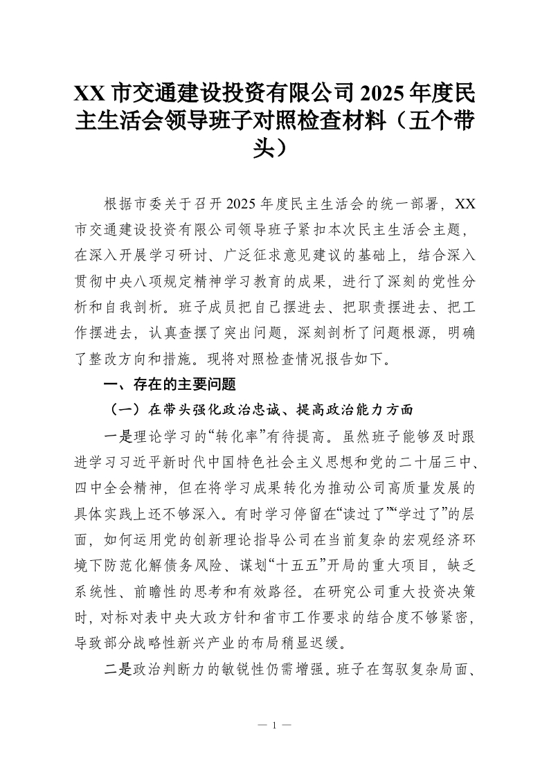 XX市交通建设投资有限公司2025年度民主生活会领导班子对照检查材料(五个带头)