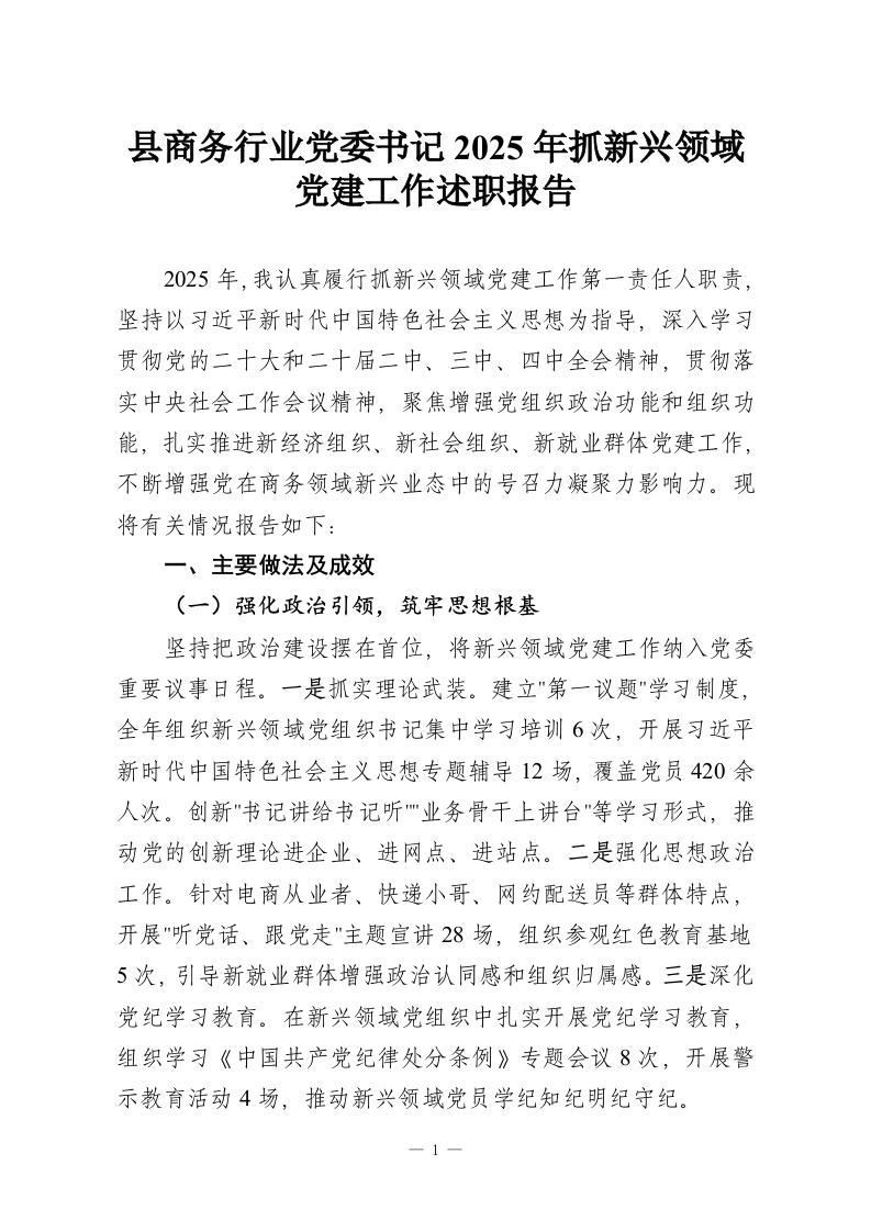 县商务行业党委书记2025年抓新兴领域党建工作述职报告