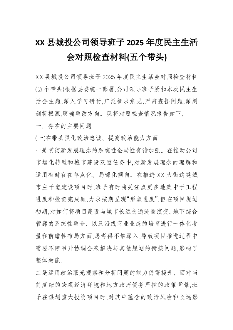 XX县城投公司领导班子2025年度民主生活会对照检查材料(五个带头)