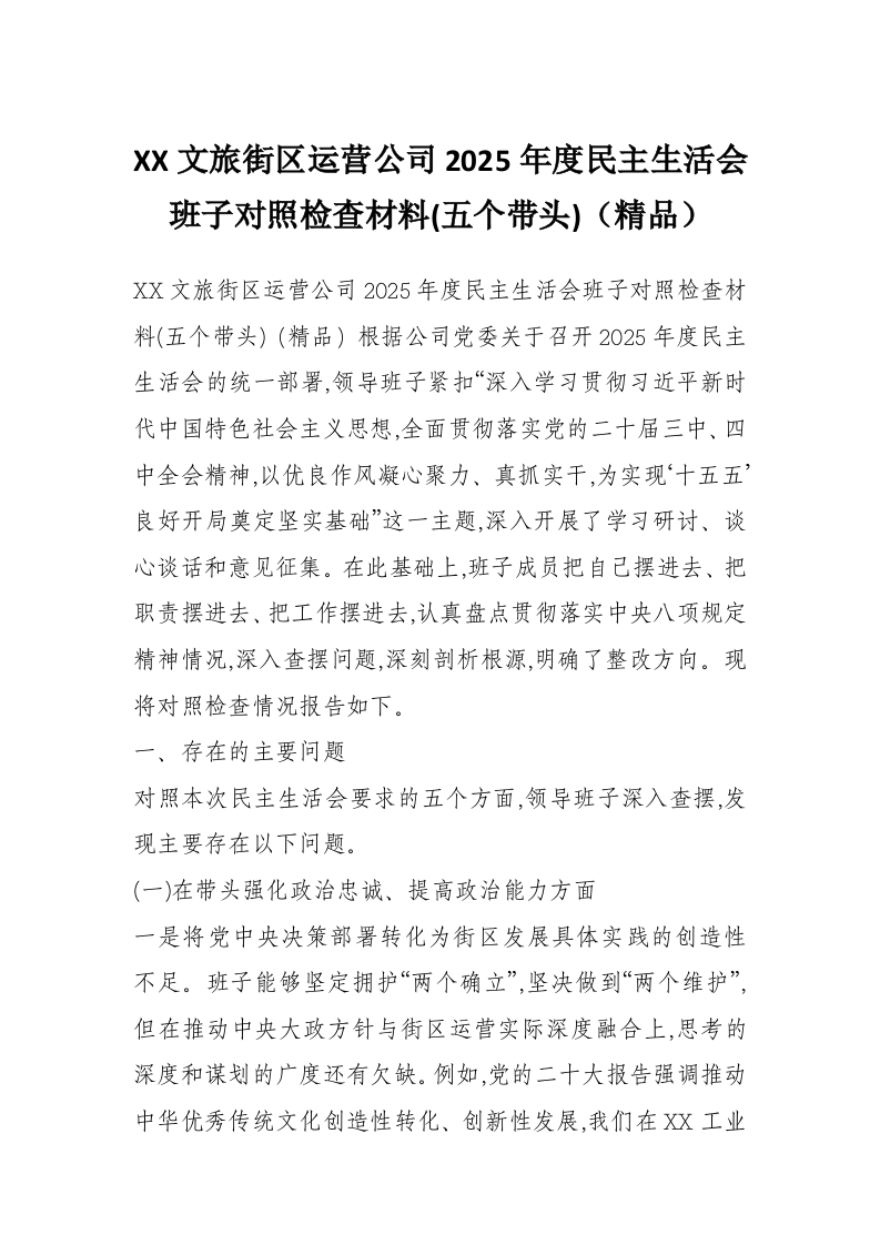 XX文旅街区运营公司2025年度民主生活会班子对照检查材料(五个带头)(精品)