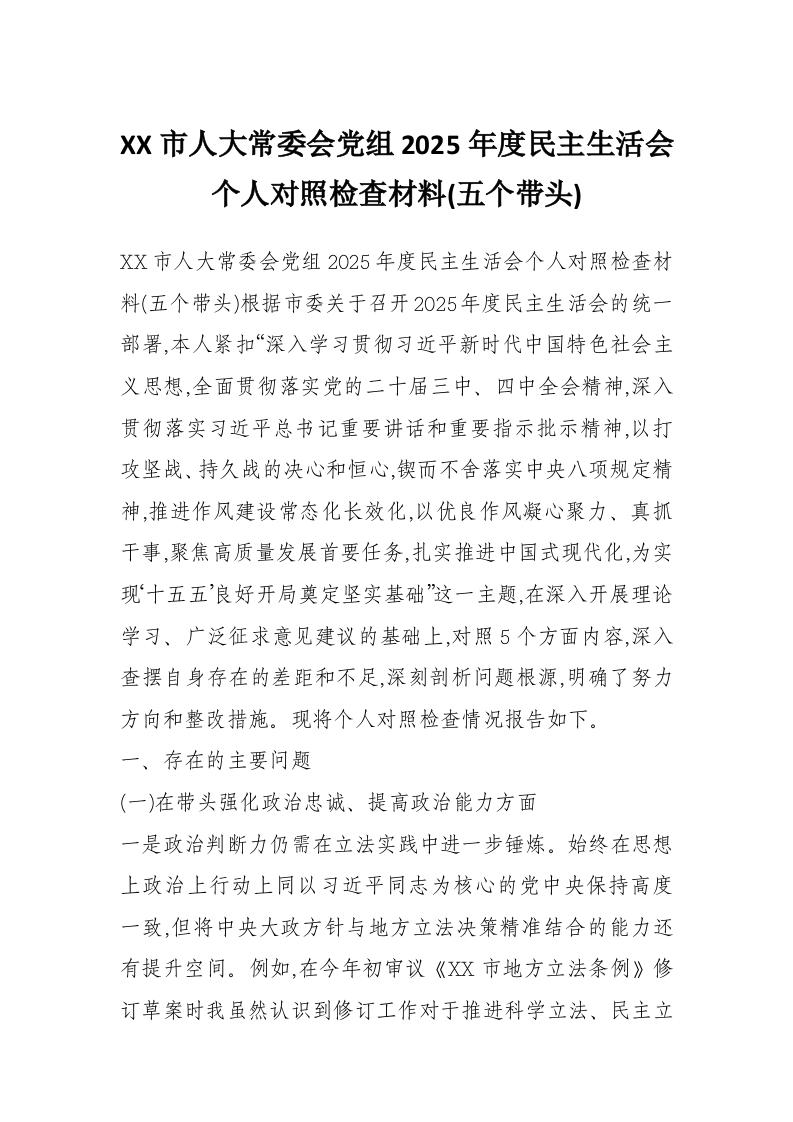 XX市人大常委会党组2025年度民主生活会个人对照检查材料(五个带头)
