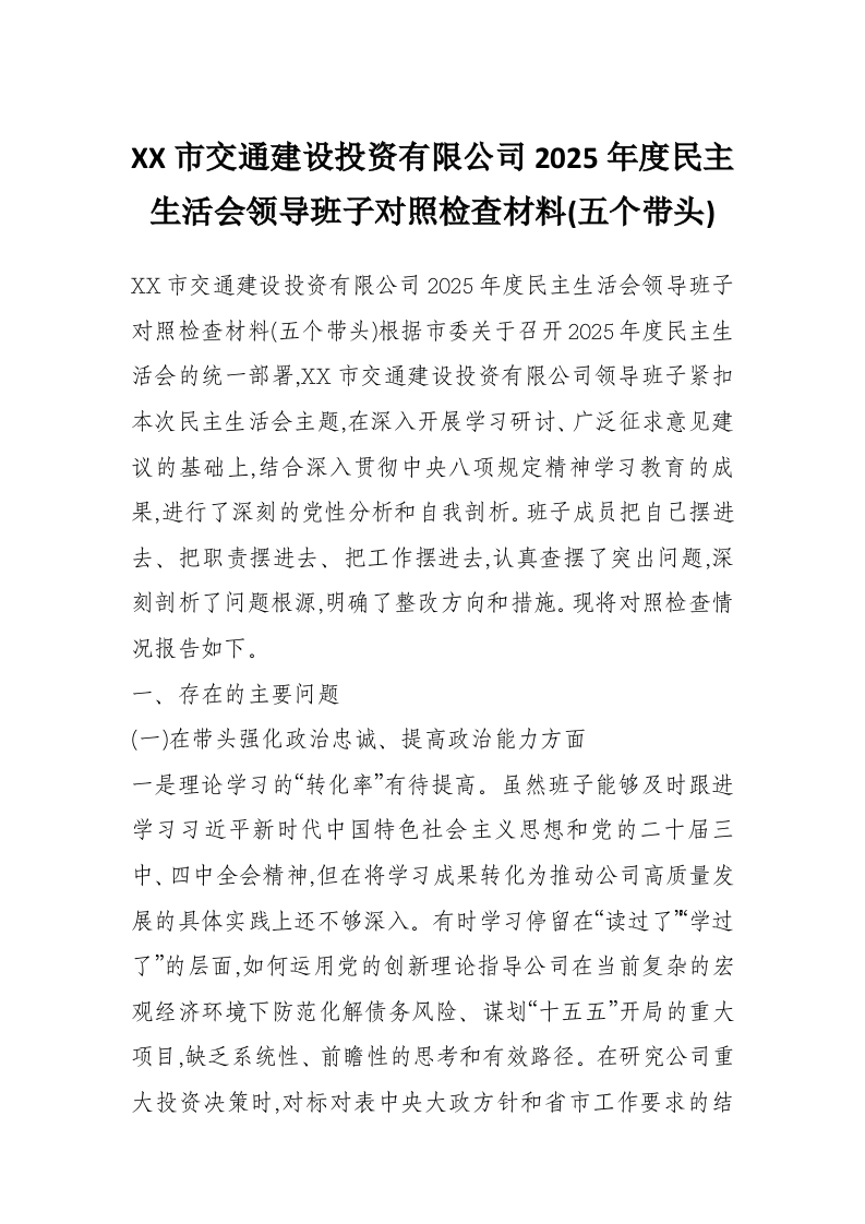 XX市交通建设投资有限公司2025年度民主生活会领导班子对照检查材料(五个带头)