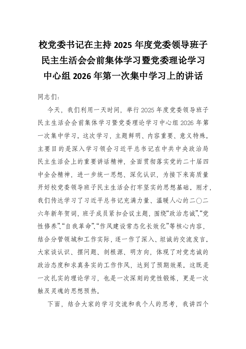 校党委书记在主持2025年度党委领导班子民主生活会会前集体学习暨党委理论学习中心组2026年第一次集中学习上的讲话