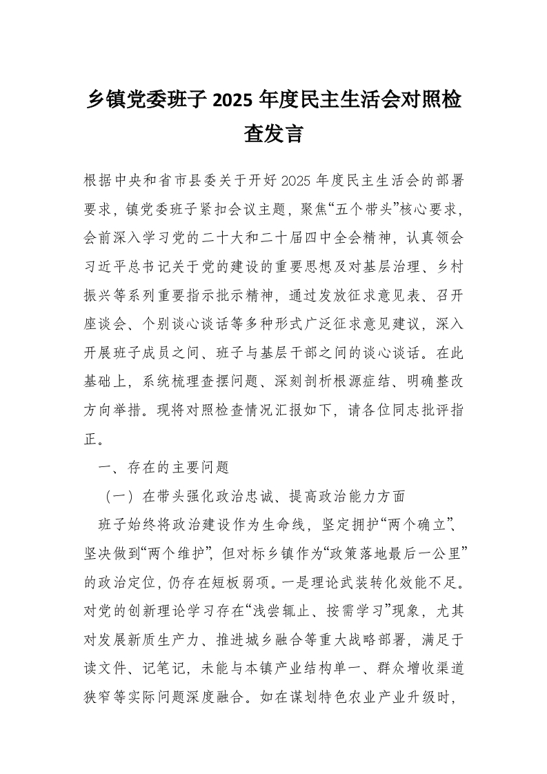 首页工作文档乡镇党委班子2025年度民主生活会对照检查发言