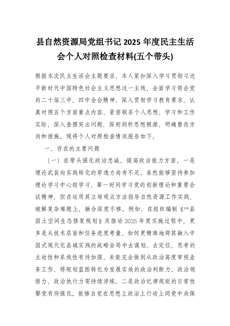 首页工作文档县自然资源局党组书记2025年度民主生活会个人对照检查材料(五个带头)
