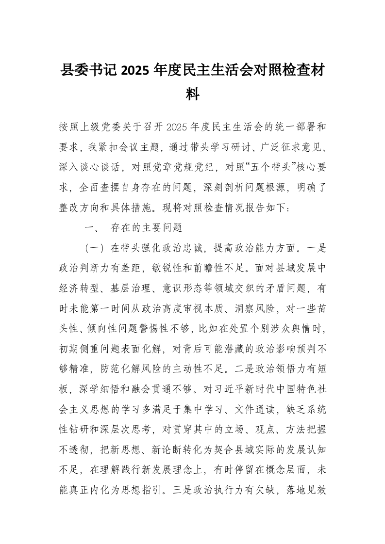 首页工作文档县委书记2025年度民主生活会对照检查材料