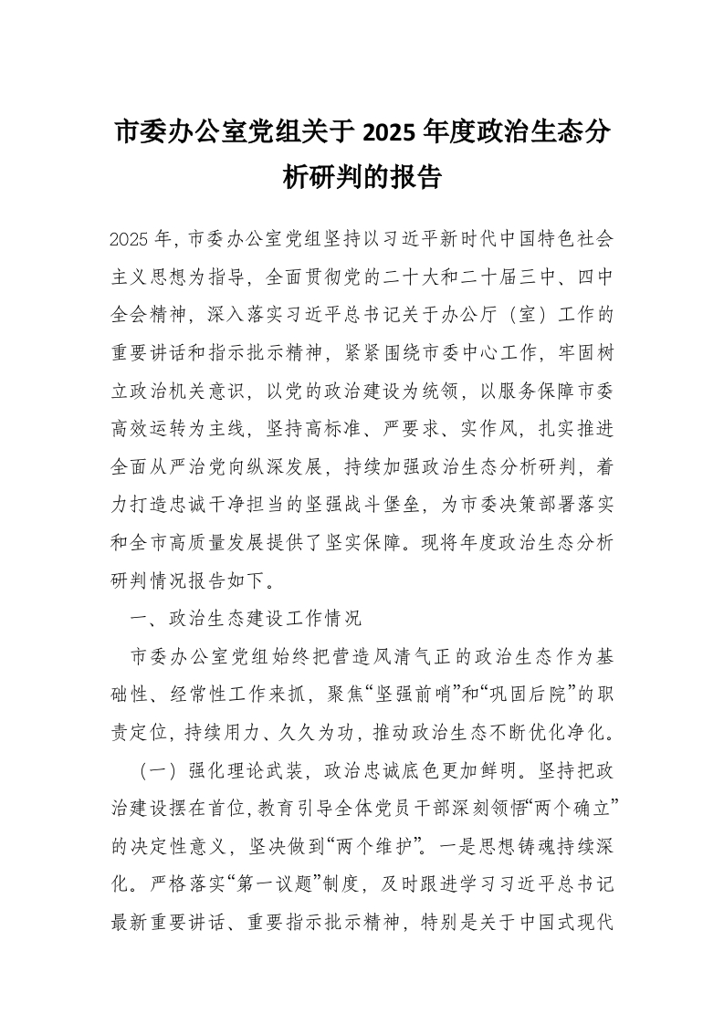 市委办公室党组关于2025年度政治生态分析研判的报告