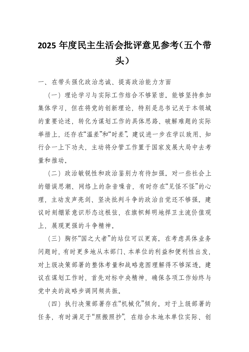 2025年度民主生活会批评意见参考(五个带头)