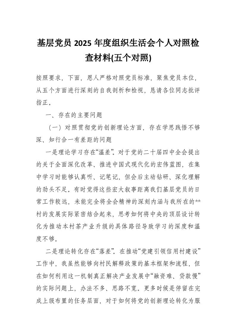 首页材料汇编基层党员2025年度组织生活会个人对照检查材料(五个对照)